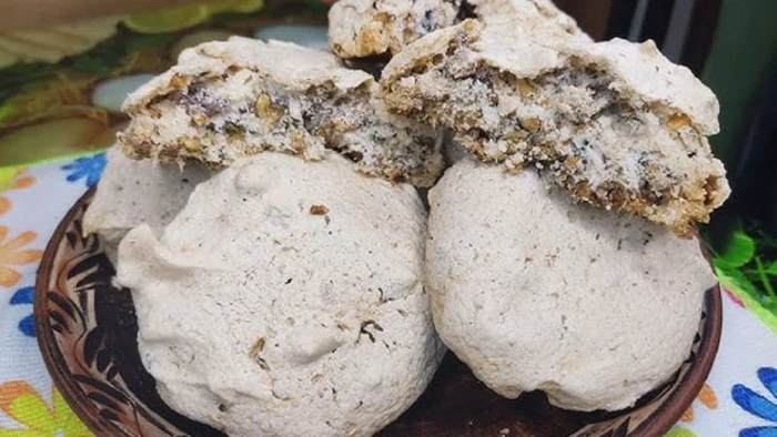 Acest desert seamănă cu meringue, dar cu o aromă mai intensă datorită nucilor și nucii de cocos. Este perfect pentru cei cărora le plac produsele de patiserie de casă, fără complicații.
